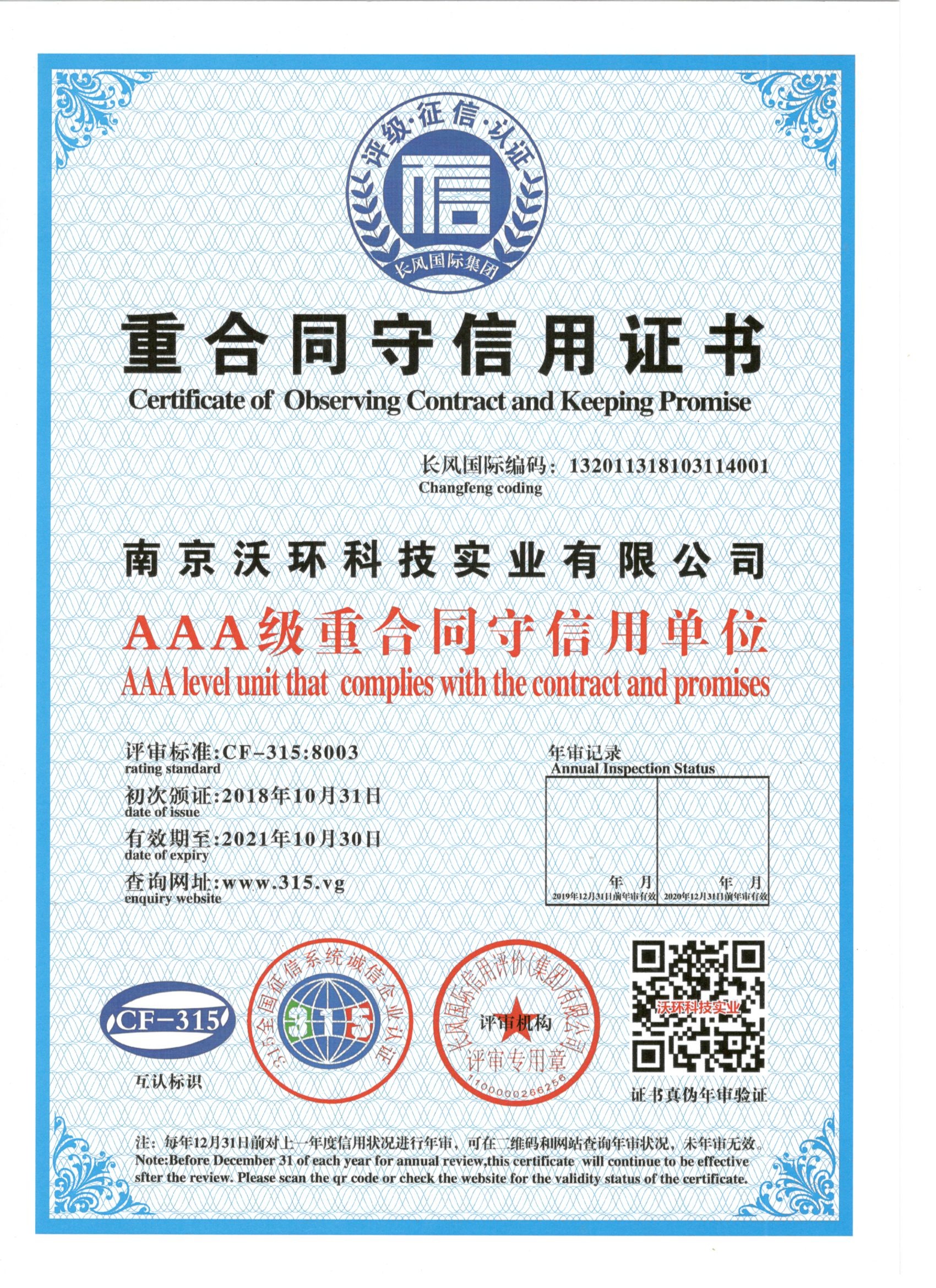 熱烈祝賀南京沃環(huán)公司被專業(yè)評審機構-長風國際集團評為AAA級重合同守信用單位,特發(fā)此證書