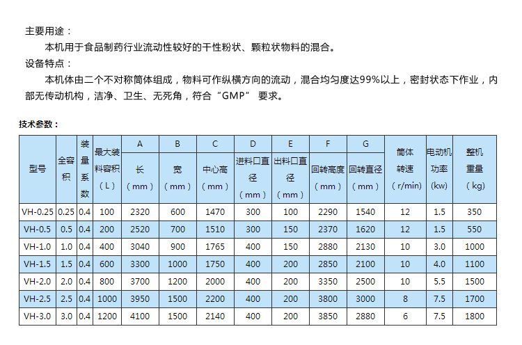 本機用于制藥及其它行業(yè)的粉狀或粒狀物料混合之用。本系列混合機有高效混合型和普通混合型兩種,高效型混合機主要對較細(xì)的粉;?qū)δ骋恢髁虾枯^少的物料均能混合均勻;普通型混合機主要適用于一般物料或產(chǎn)量較大的企業(yè)使用。筒體光滑無死角、整機采用不銹鋼材料制作、且外型美觀等特點。